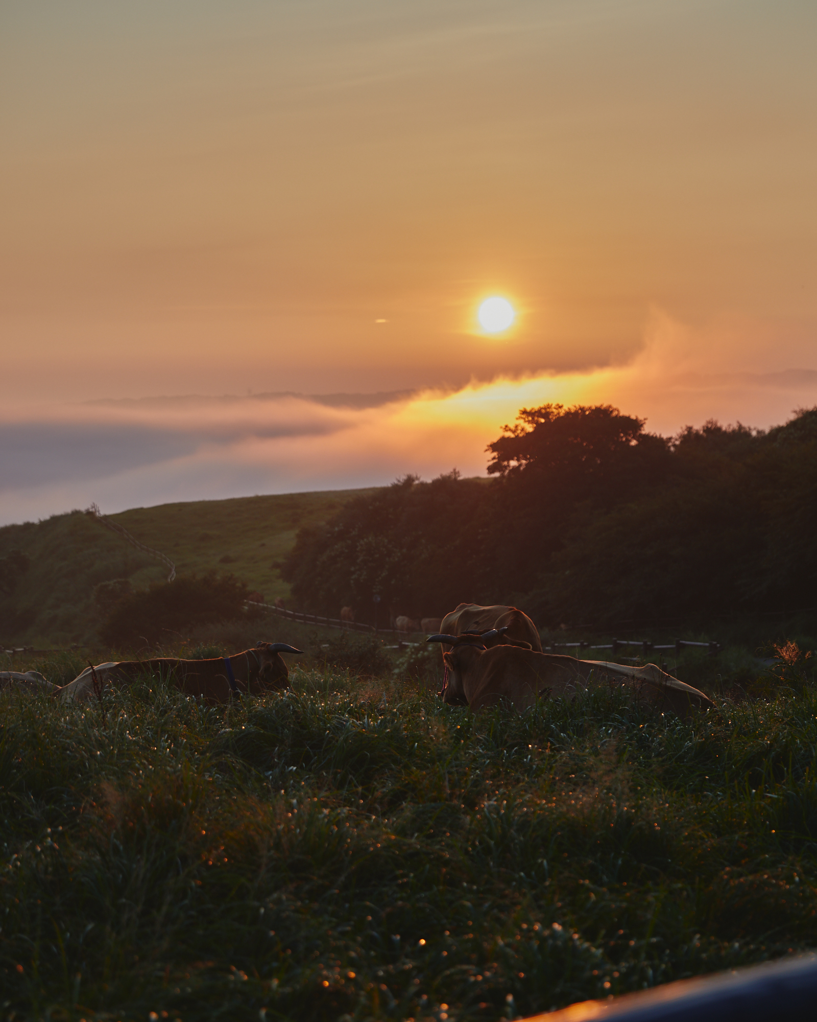 ……最高すぎる。美しい朝焼けと雲海を牛たちと一緒に拝むことができた……!草千里を目指してもう少し進んでみると、車を停めて朝日を見つめる人が。
