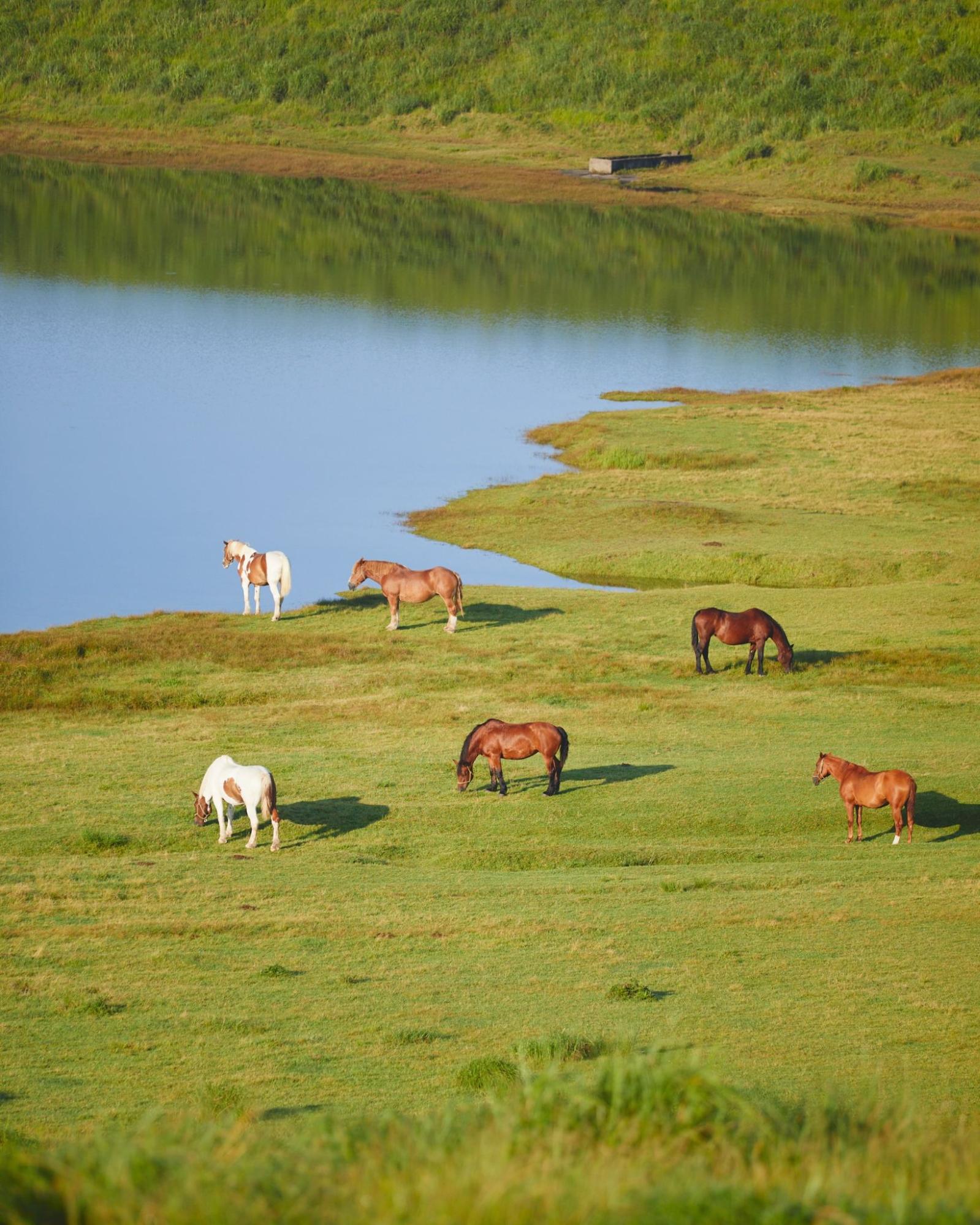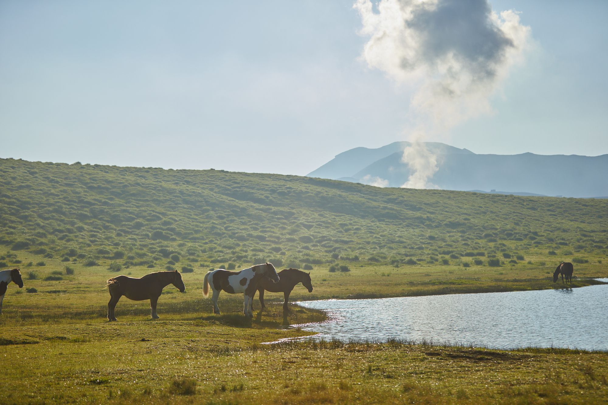 到着した草千里では朝ご飯タイムの馬たちに出会えた。