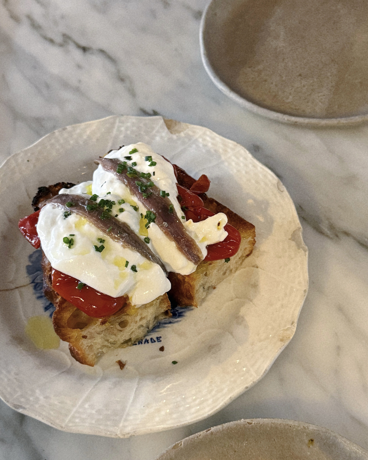 地中海料理のお店。薄クリーム色の石壁にワインのイベントのポスターがたくさん貼ってある。目が合うたびにっこり微笑んでくれる店員さんにときめき。一品目のアンチョビ・砂糖漬けトマト・ブラータ乗せのフォカッチャが幸福の味だった。