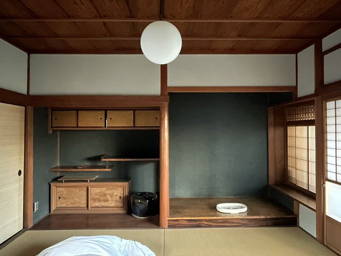 kidoの居室。違棚と床柱、床の間が残された和室でお布団で眠ることができると嬉しくなる