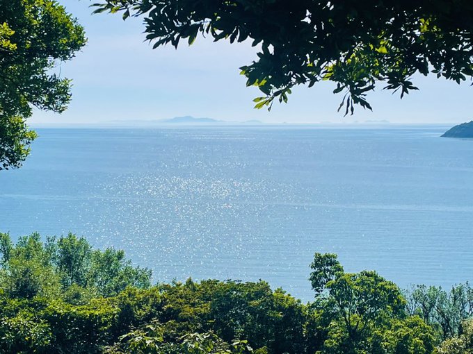 海まで歩いて行くことができる。牛窓神社へ行く途中の参道から見える瀬戸内海。瀬戸内らしい水平線のうっすらとした島かげがいとしい