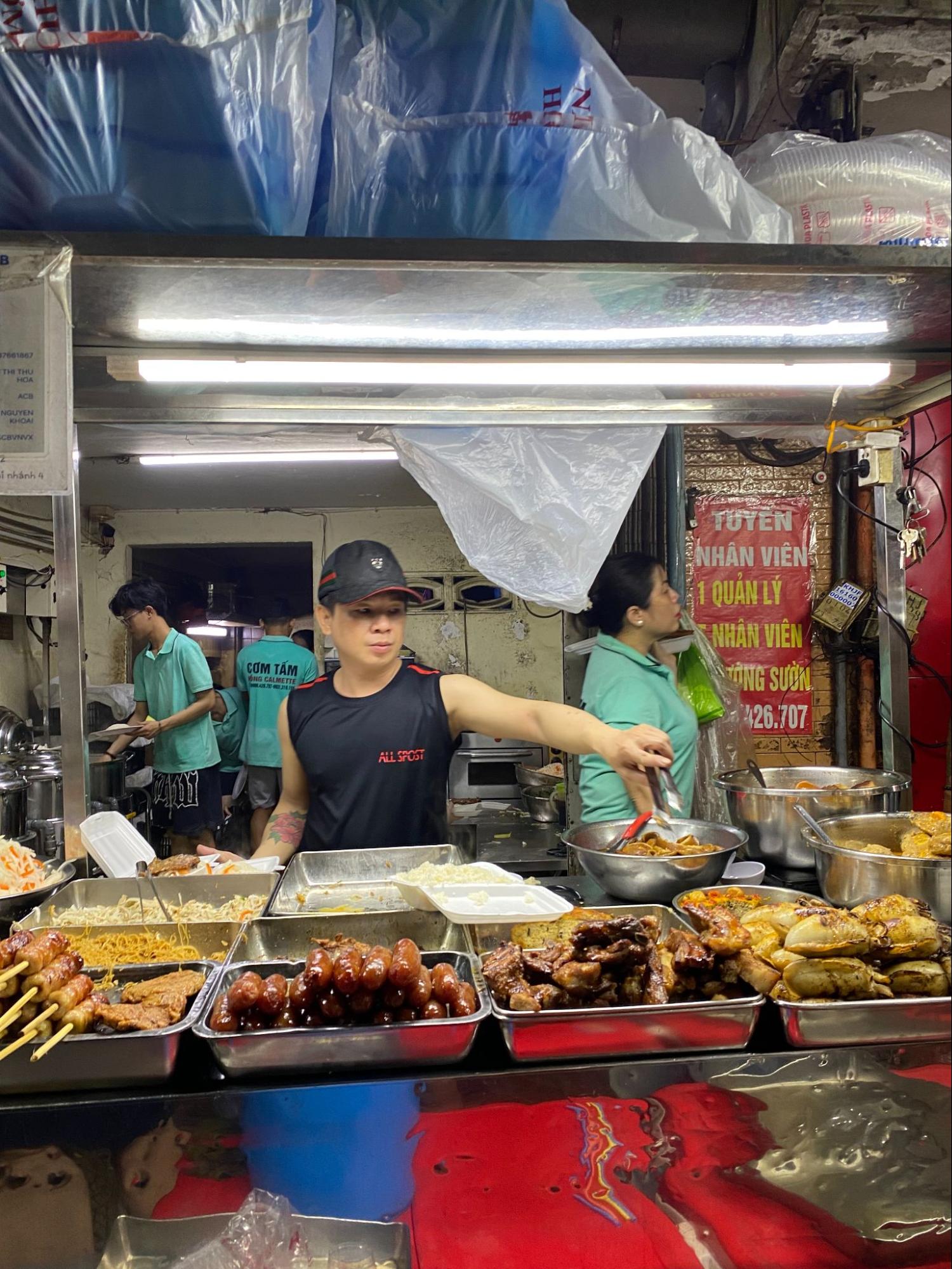 私たちが訪れたコムタム屋さんも、文字通り、道のど真ん中にあった。もちろん店前に並ぶ列などはなく、慣れた現地の方々に負けじと注文しなければ、コムタムにはありつけない。自分でメインの具材を選べるシステムだったが、ベトナム語がさっぱりなので笑顔と指差しで乗り切る。たまに現地の言葉しか通じない場所や、自分と常識が大きく異なる場所に行くと、大きな世界にポツンと迷い込んだ子どもみたいな気持ちになる。でもその特有の孤独感が、結構好きだったりする。