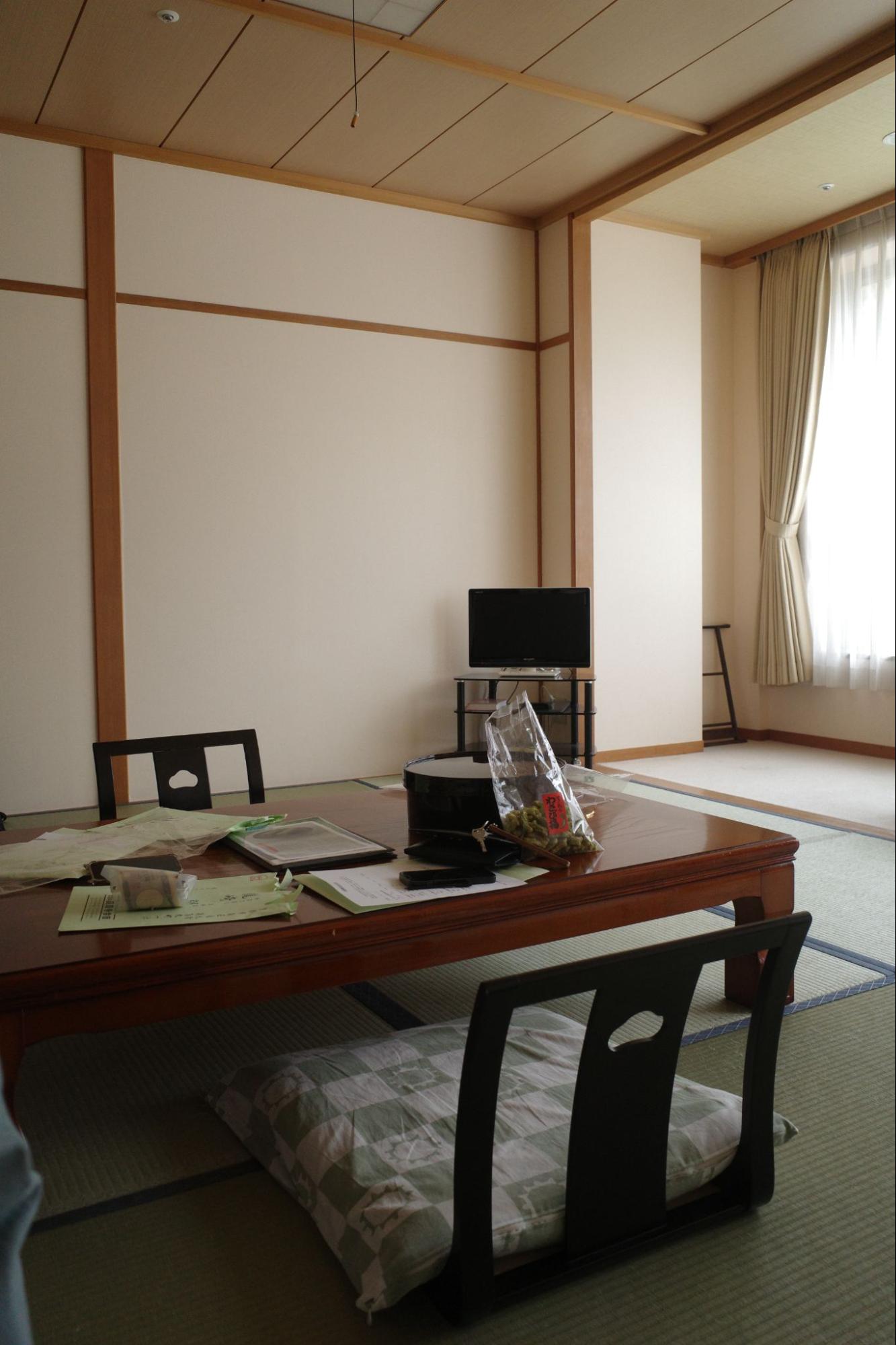 昔ながらの温泉ホテルのような雰囲気の客室。売店で売っているワサビ味のおかきが美味しい