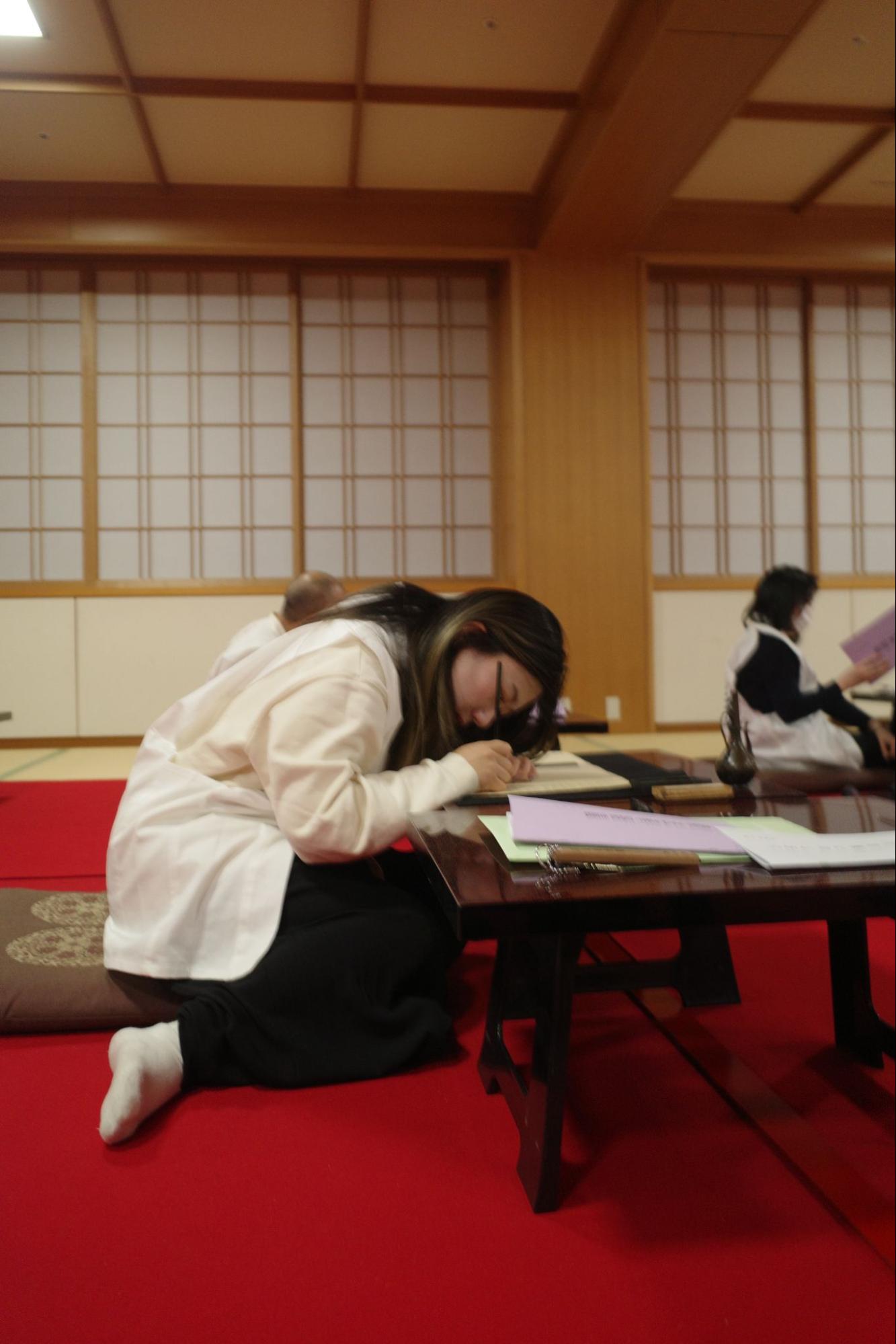 初日より圧倒的な集中力で写経を書き上げる