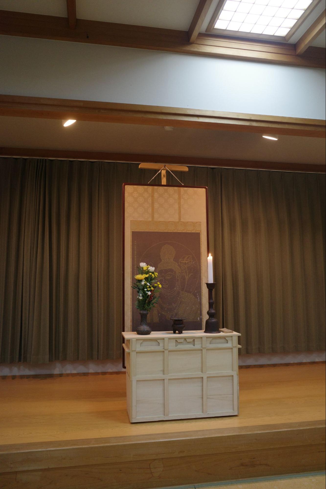 食事会場のステージ正面には仏壇が設置されていた