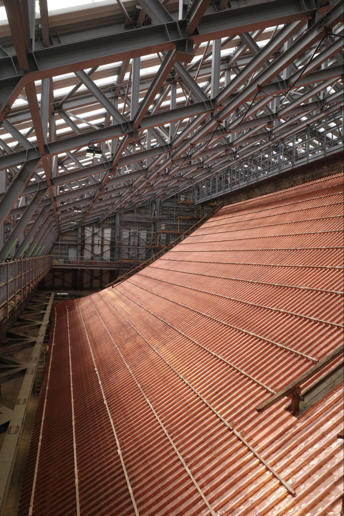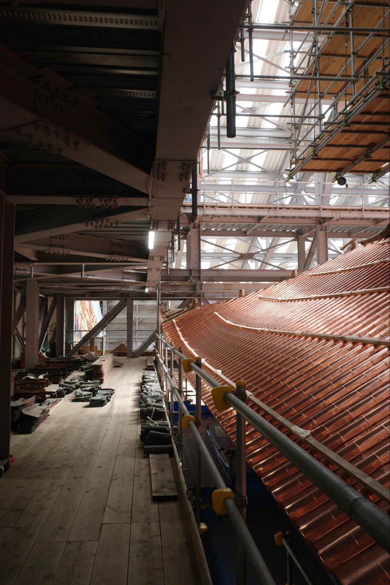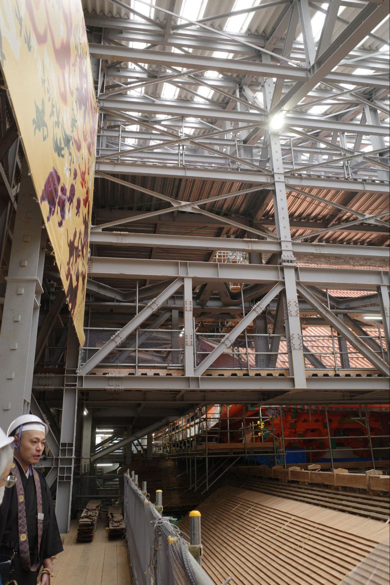 食後は、現在改修中だという根本中堂の見学へ。10年以上かけて本堂の屋根の銅板葺きや塗装彩色の修理が行われているという。朝座勤行をしていた頃はまだ薄明かりだったため全体像があまり見えていなかったが(どうやら工事をしているらしいということは感じられた)、日が登ったことで世界遺産の工事現場をじっくりと見学することができた。