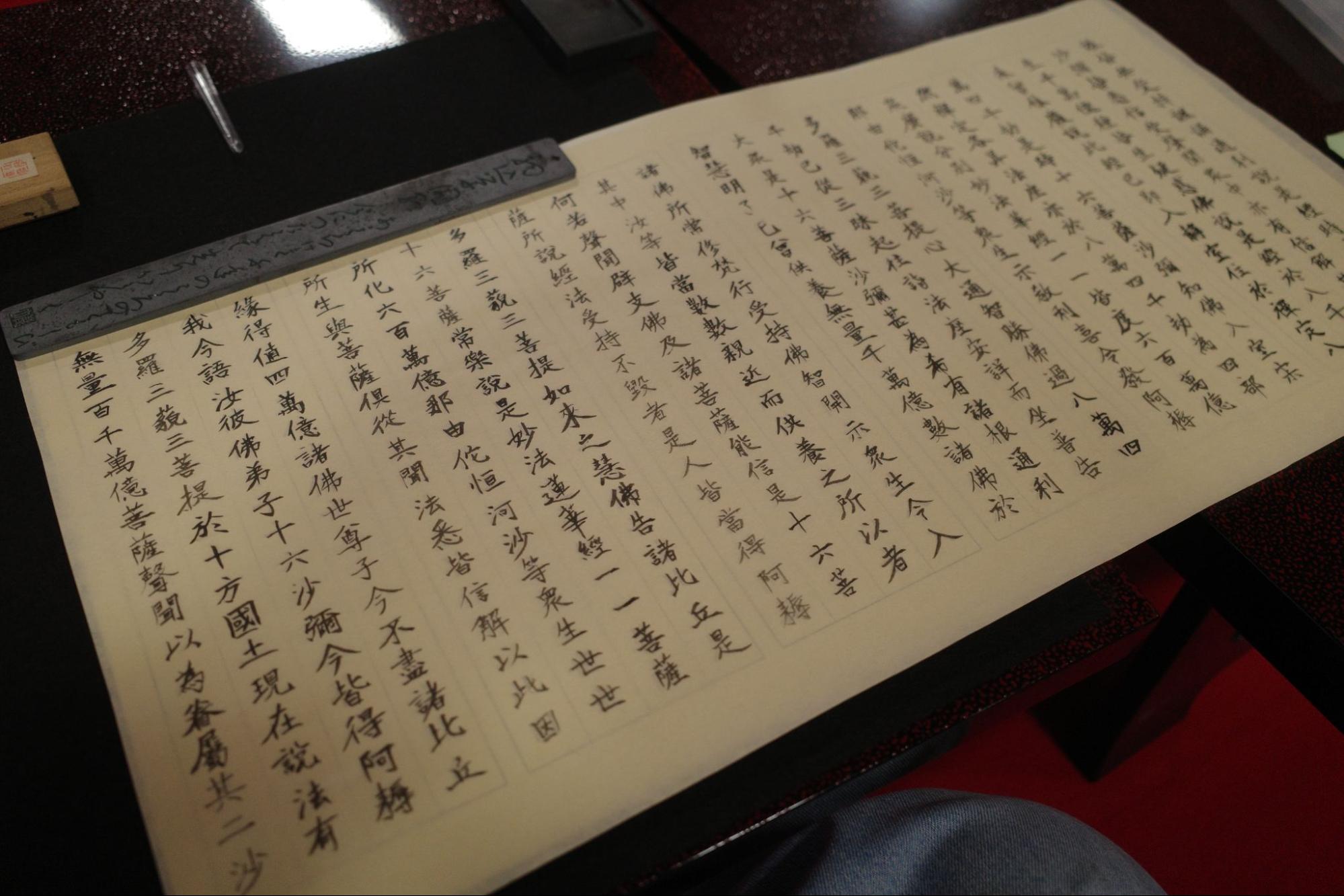 薄い半紙の上からお手本を書き写すだけだから簡単でしょ〜と当初は思ったが、筆遣いに慣れていないこともあり濃淡や字のテンションにどうしてもムラがでてしまう。上手に書いてやろう、周りより早く書いてやろうという欲深さも字面に滲み出て、次第に鼻につくようになる。一緒に写経をしてくださっているお坊さんの書面を覗いてみると、一貫して安定感のある筆致で、こういうところに修行の積み重ねの差が歴然と現れるのかと感嘆した。