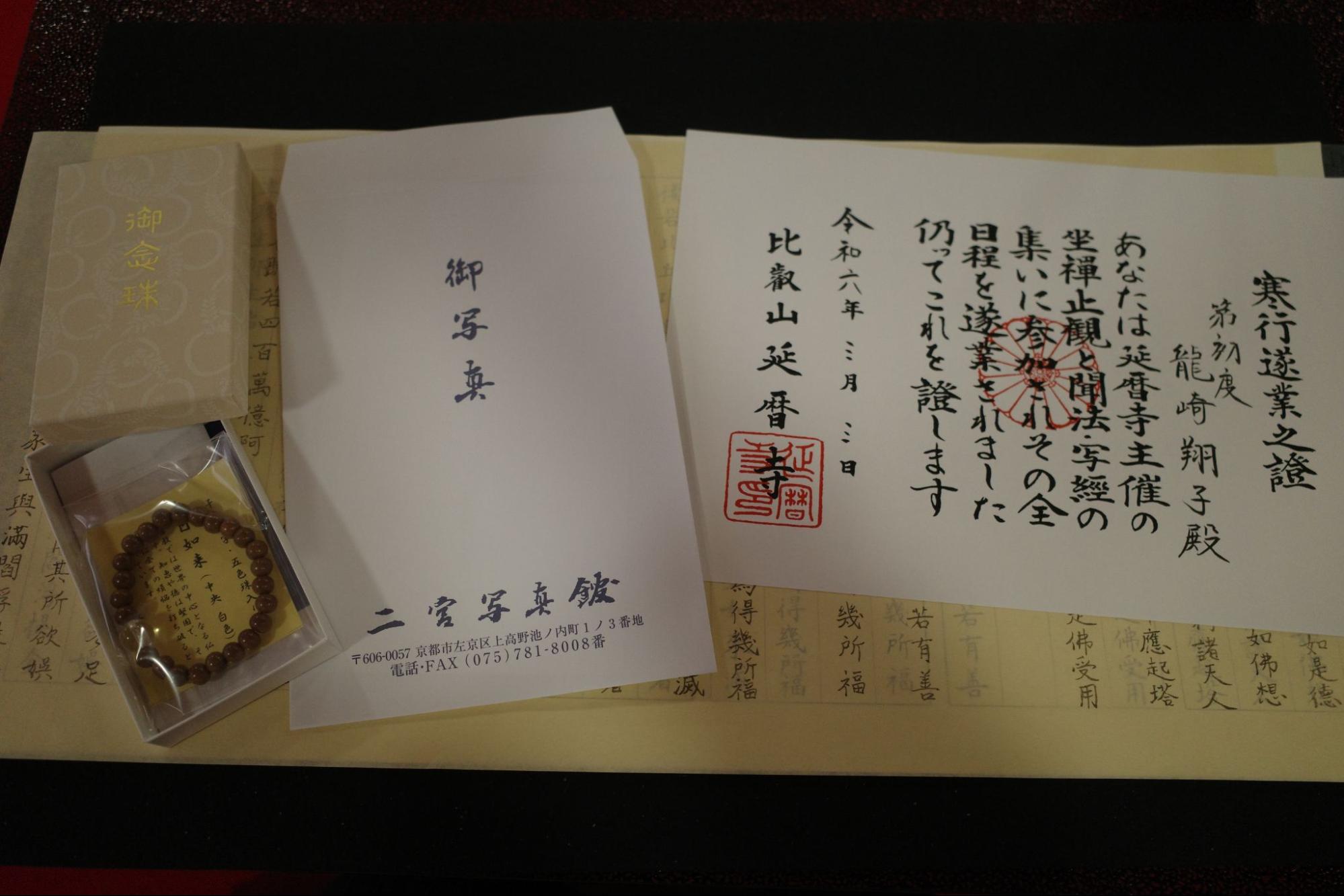 最後には、写経の奉納式、閉講式が行われ、あたかも卒業証書授与のような賞状と、オリジナルの数珠が記念品として贈られる。この数珠は、聞けばなんと次回参加する際に珠の色を1つずつ変えてもらうことができるらしい。...なるほど、なんというマーケティング施策。