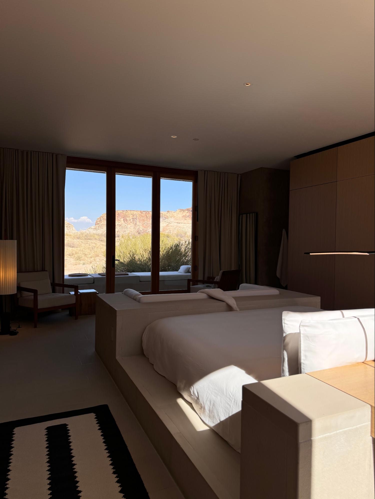 きっかけは、ロサンゼルスからフェニックスまで、2週間かけてアメリカを横断するロードトリップに出かけたことでした。アンテロープ・キャニオンを通り過ぎ、ふと調べてみると、あの「AMANGIRI」が近くにある。しかも、なんという偶然か、その日だけ1泊部屋が空いているというのです。でも、目玉が飛び出るほど高い。最初は私もビビって、やめようとしましたが、こんな経験はもう絶対にないからと、夫に説得され、泊まることにしました。